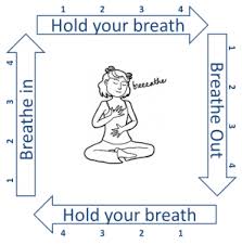 Square breathing: Breathe in for 5 seconds and imagine the side of a square being drawn. Then hold your breath for 5 seconds as you ‘see’ the next side of the square being completed. Exhale for 5 seconds, watching the third side of the square being drawn. And, hold for 5 seconds, watching the full square take form. If you have difficulty ‘seeing’ the square, feel free to just focus on counting each part of the breath. While focusing on your breath in these ways, you will find that you are not worrying about other things.